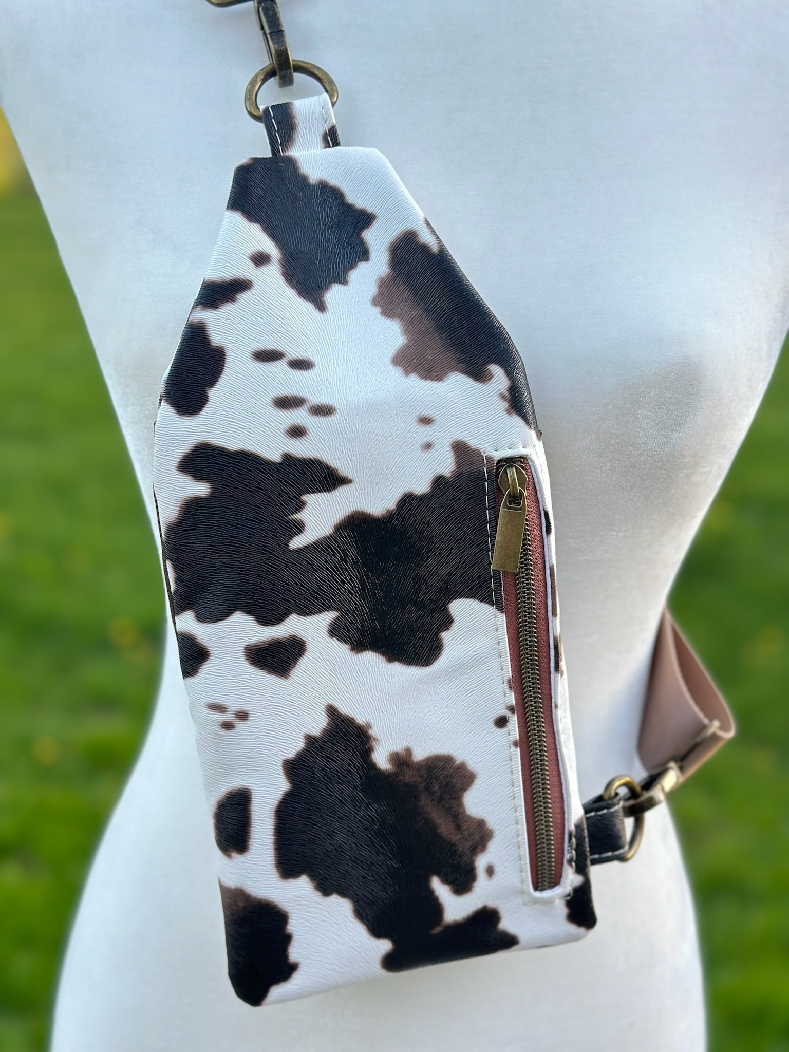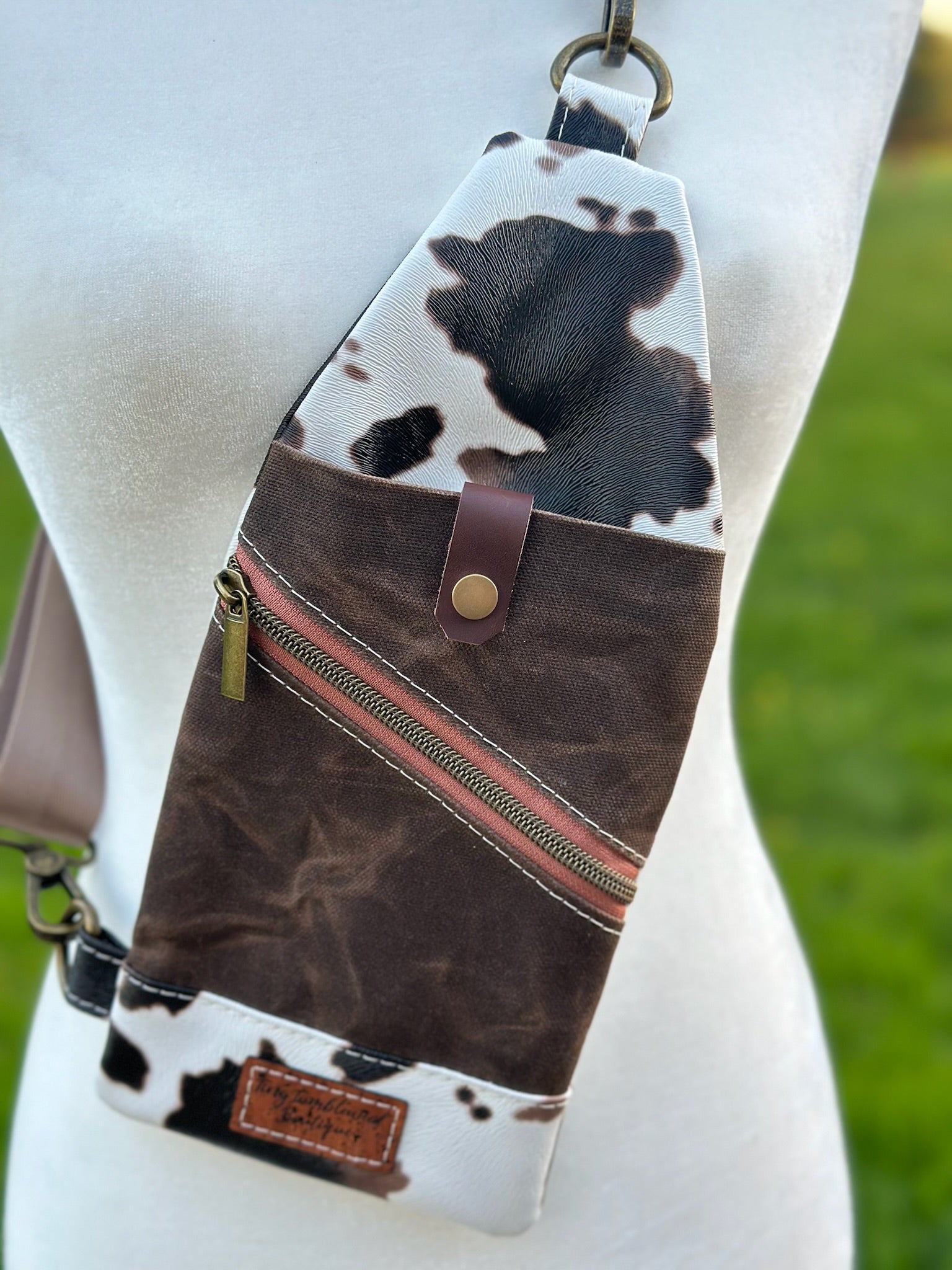 This mini travel sling is made from faux leather and waxed canvas fabrics.