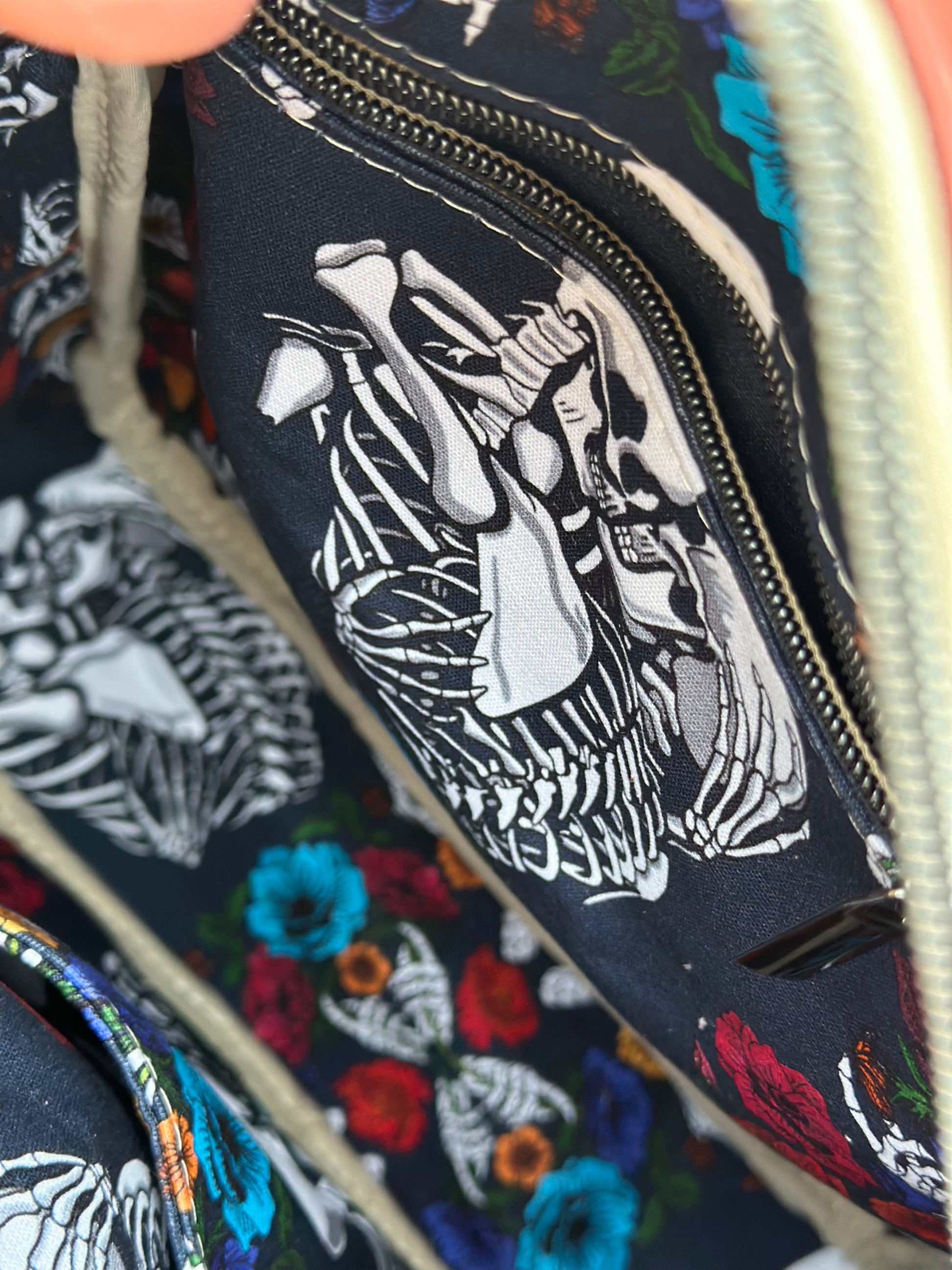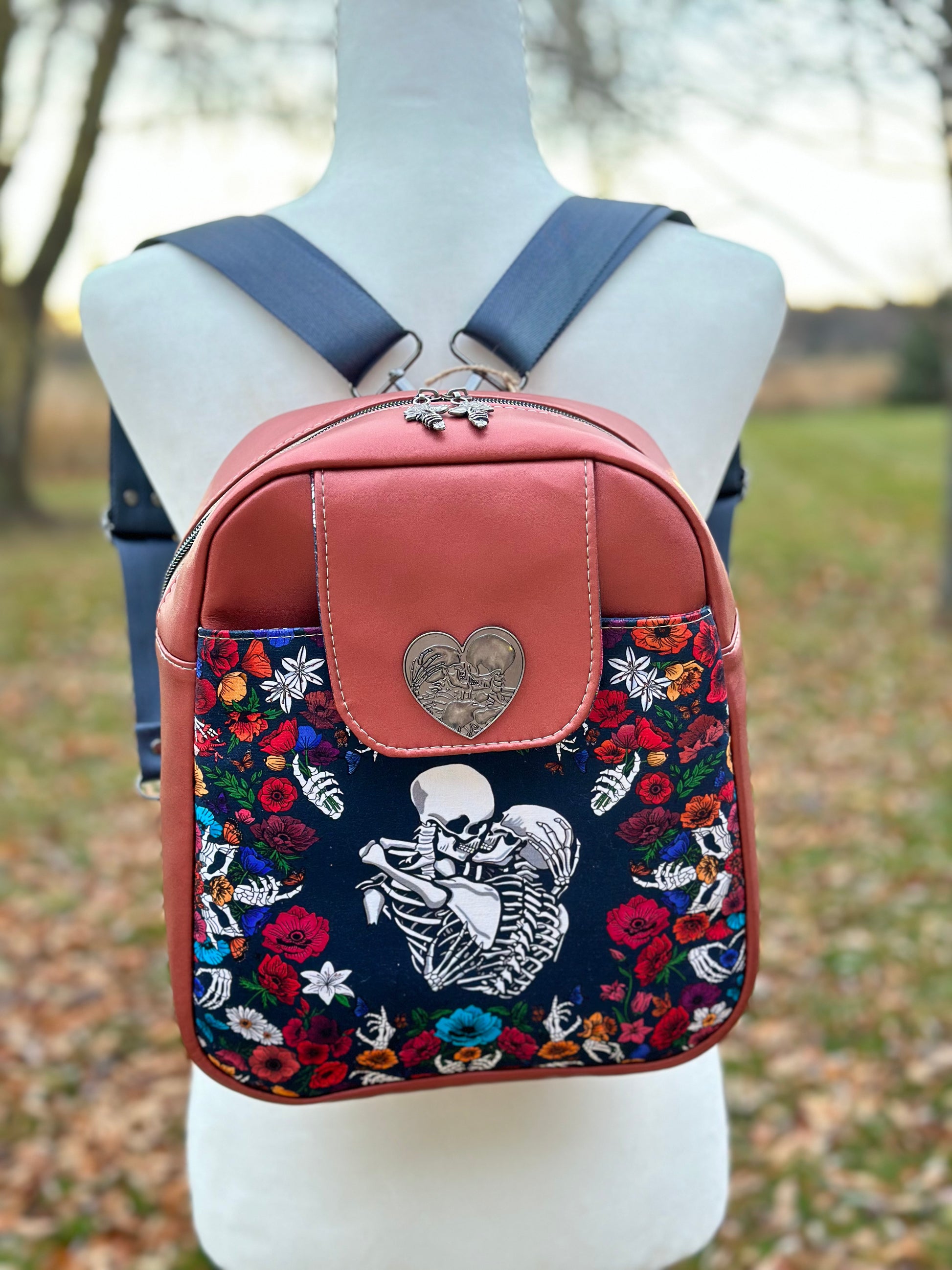 This mini-backpack is anything but mini! Made from high quality faux leather and custom cotton canvas fabric. The exterior includes a custom magnet closure for the front slip pocket. The interior features the same custom fabric, as well as a zipper pocket and an additional slip pocket. Adjustable straps make this comfortable for any wearer.
