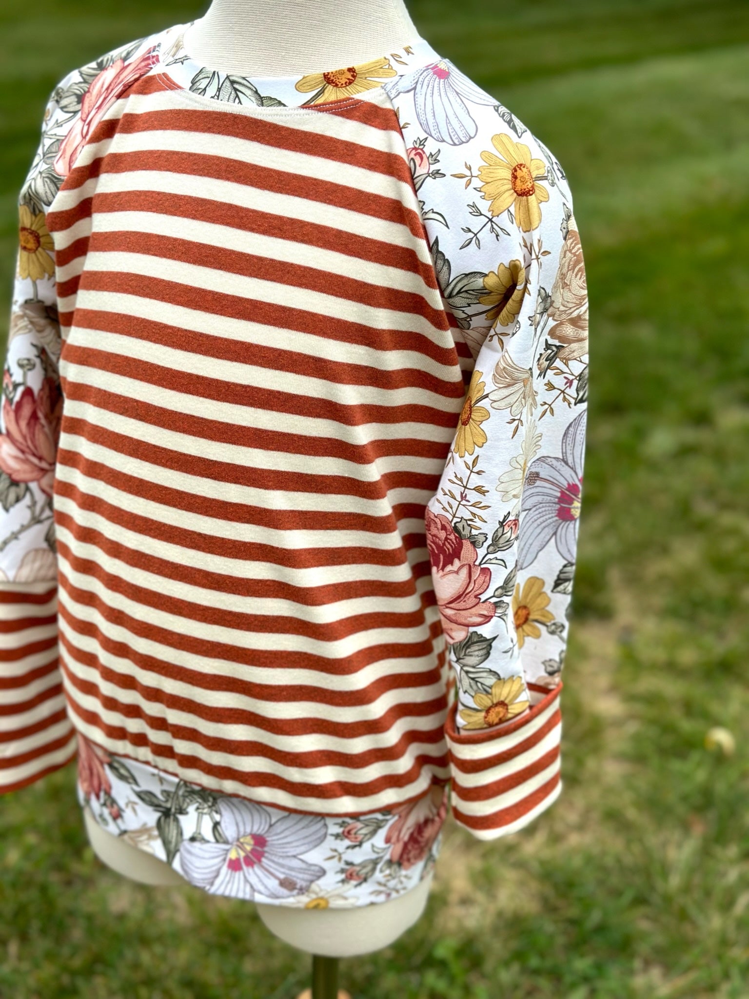 This autumn floral hoodie is made to set you apart. Made from lightweight, custom printed, stretchy fabric it is the perfect top for layering. Grow with me sizes are meant to last 3 years or 3 sizes, giving your little one ample time love and enjoy this top. A great piece for this fall.