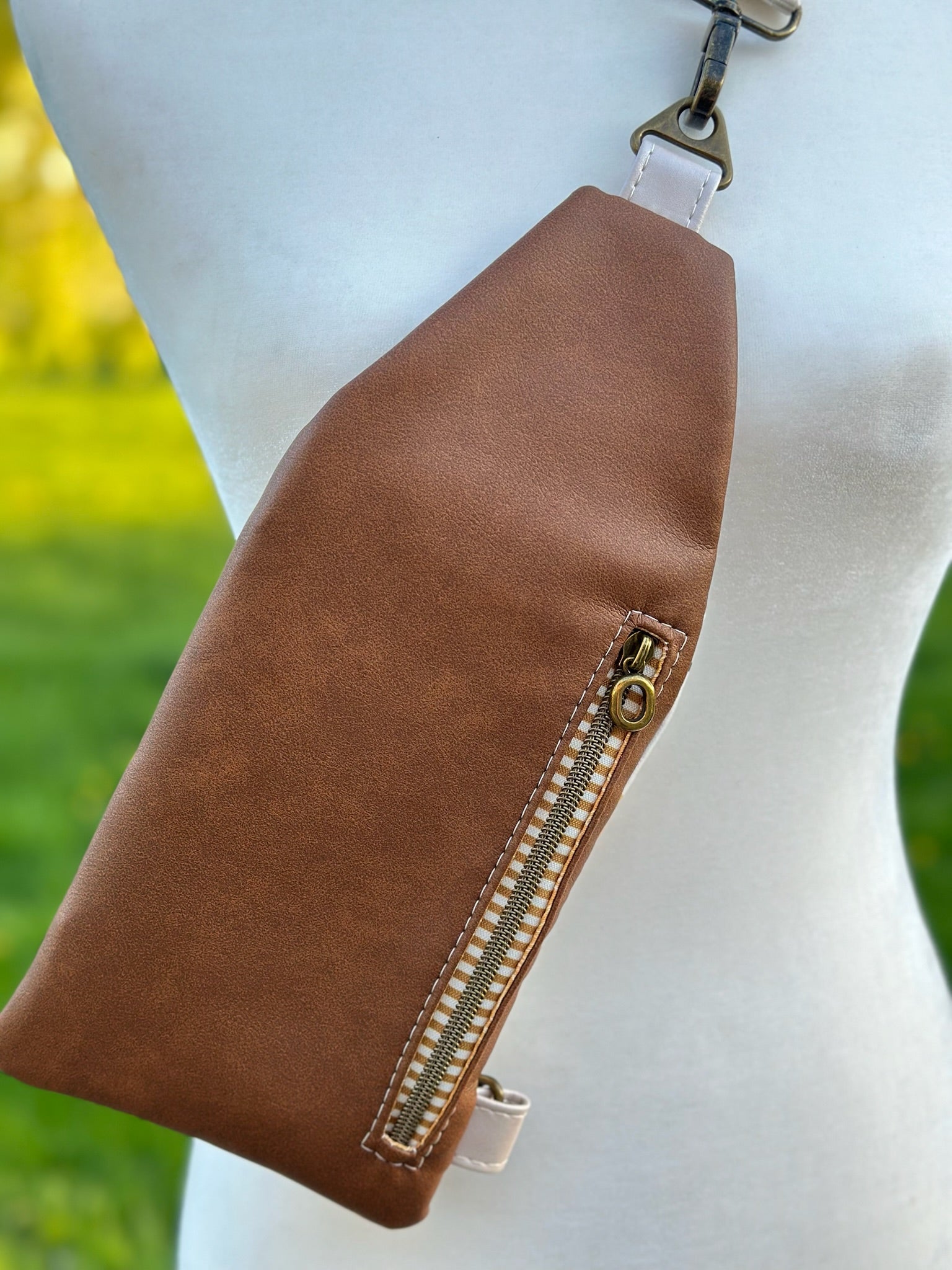 This mini travel sling is made from buttery soft faux leather and a beautiful floral canvas.