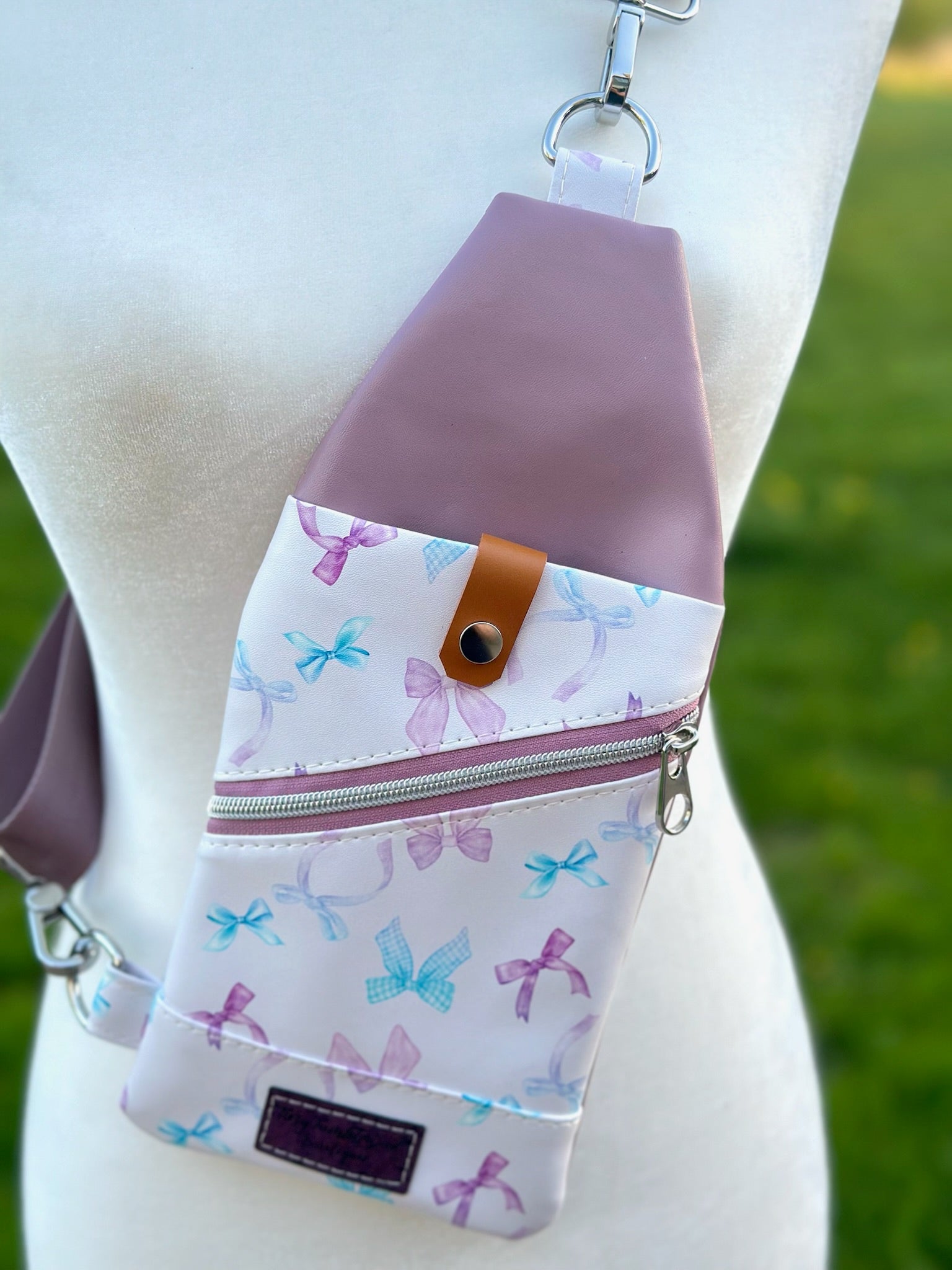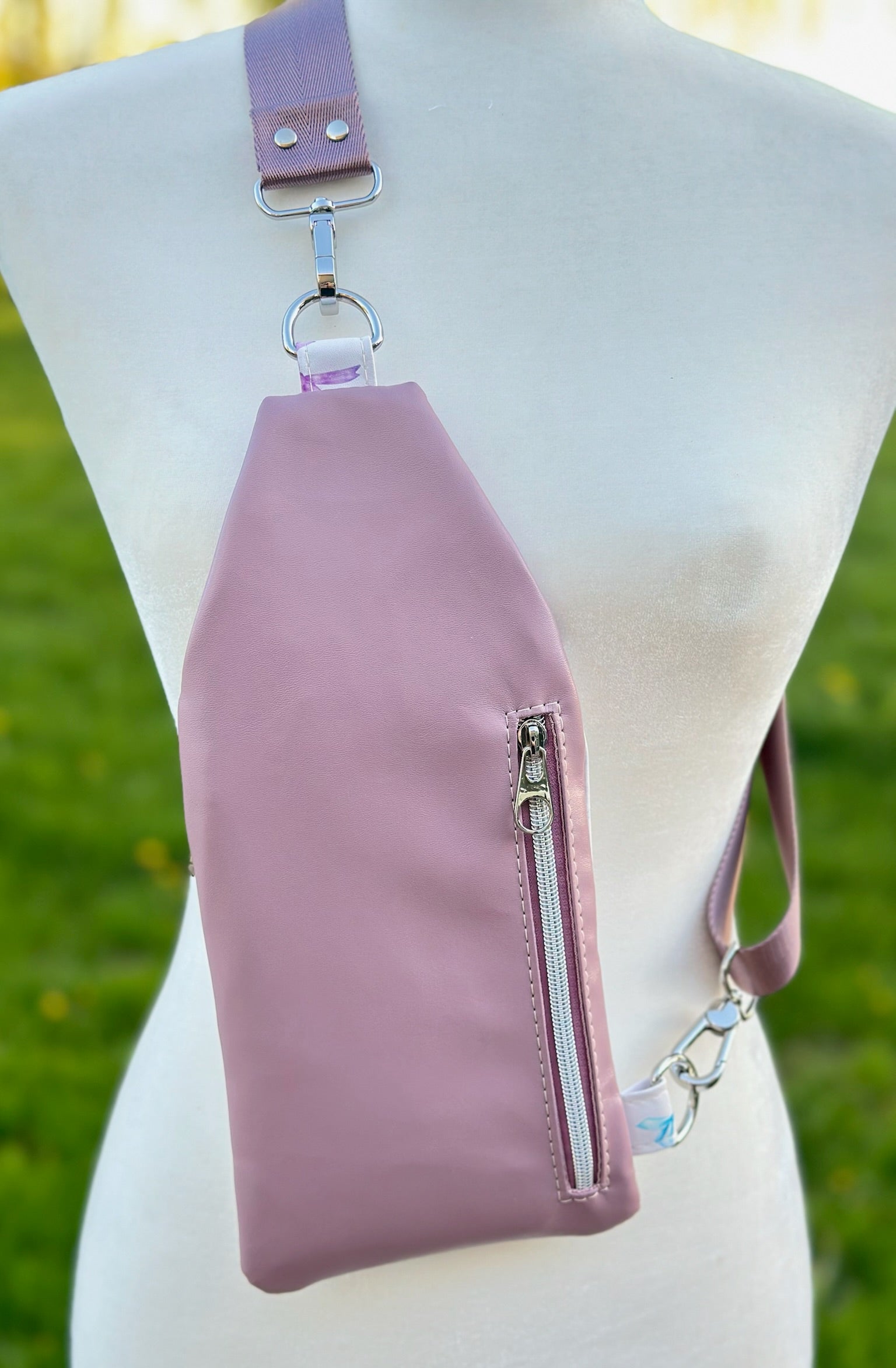 This mini travel sling is made from all faux leather and vinyl fabrics, making it extra durable.